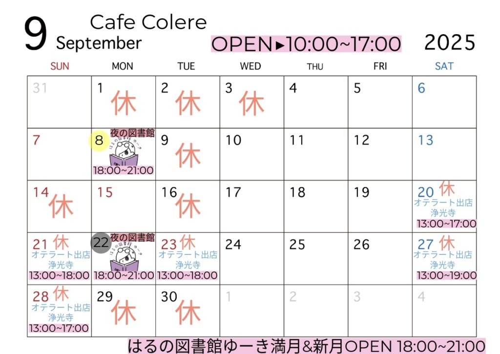 9月はイベント出店が多い為、店舗お休みが多くなります。